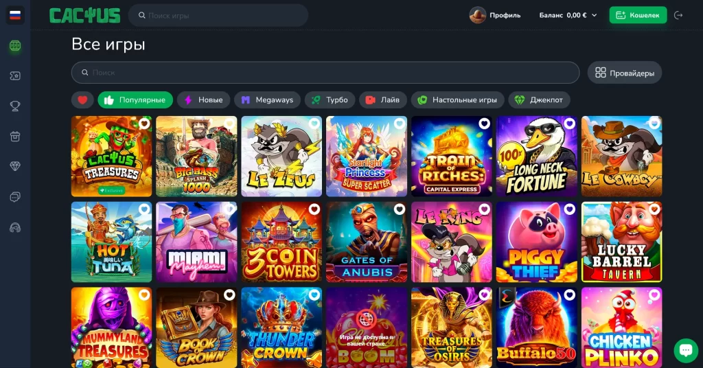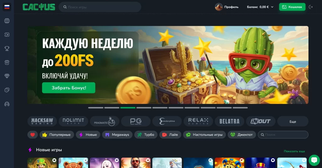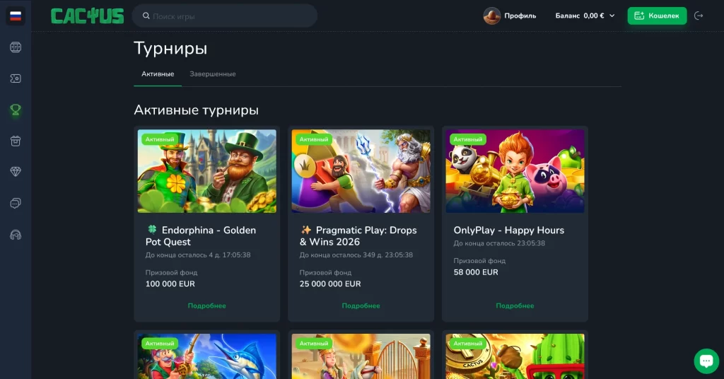 Cactus Casino хорошо раскрывается у новичков, мобильных игроков, крипто-аудитории и тех, кто ценит высокий лимитный потенциал. Старт здесь низкий — от €5, а выбор игр закрывает как базовые, так и более широкие сценарии игры.