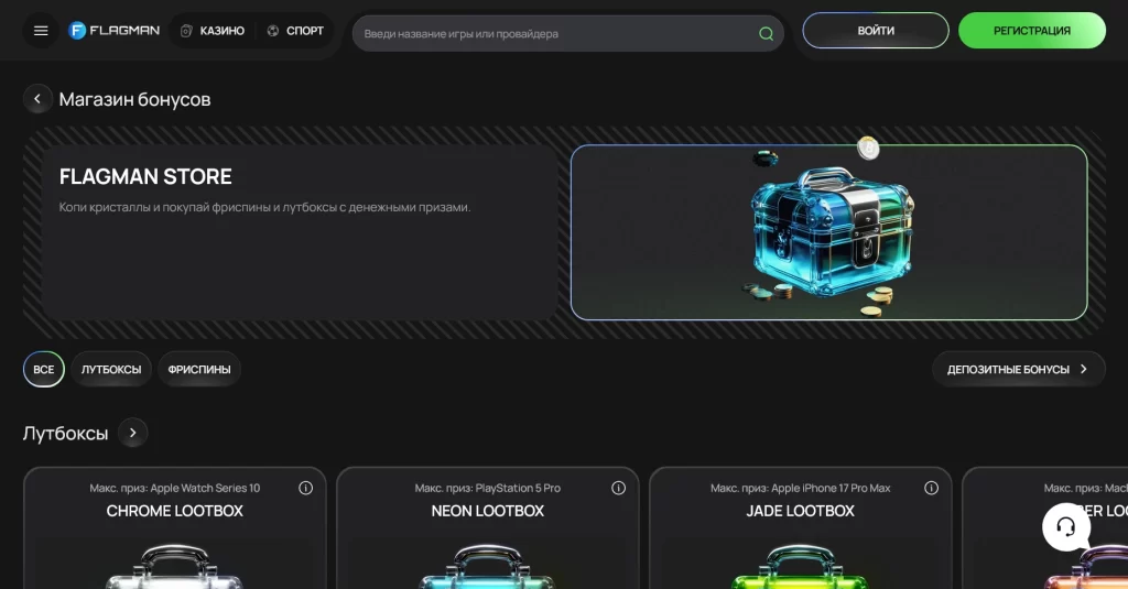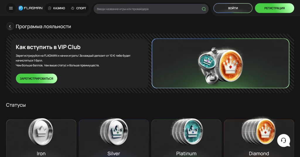 У Flagman сильная комбинация из большого ассортимента игр, локальных валют, криптовалютных расчетов и многоуровневой VIP-системы. Это не просто витрина слотов, а казино с заметным упором на регулярную игру и расширенные привилегии.