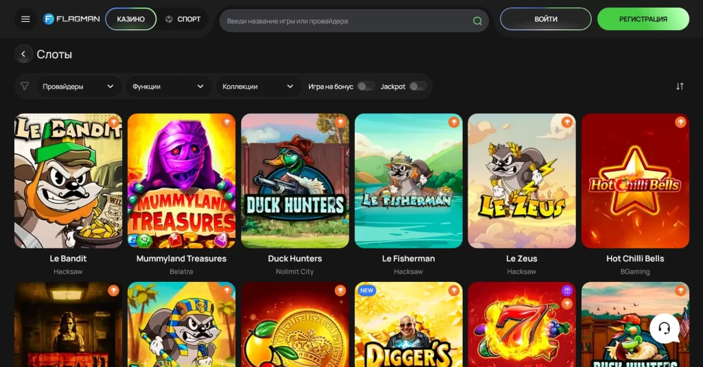 Flagman делает ставку на объем. Каталог закрывает сразу несколько сценариев: быстрые сессии в слотах, длинную игру в live-казино и выбор между классическими и более современными механиками. За счет 96 провайдеров библиотека выглядит разнопланово, поэтому площадка подходит не только новичкам, но и игрокам, которые уже знают, какие студии и стили геймплея им ближе.