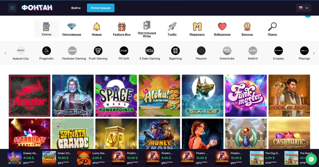 В Fontan упор сделан на слоты (около 1800 тайтлов), но также доступны рулетка, блэкджек, баккара, покер и crash-игры. По студиям заметна ставка на узнаваемые бренды: Pragmatic Play, Play’n GO, NetEnt, Hacksaw Gaming, Relax Gaming, Yggdrasil, Red Tiger, Playson, Push Gaming и другие.