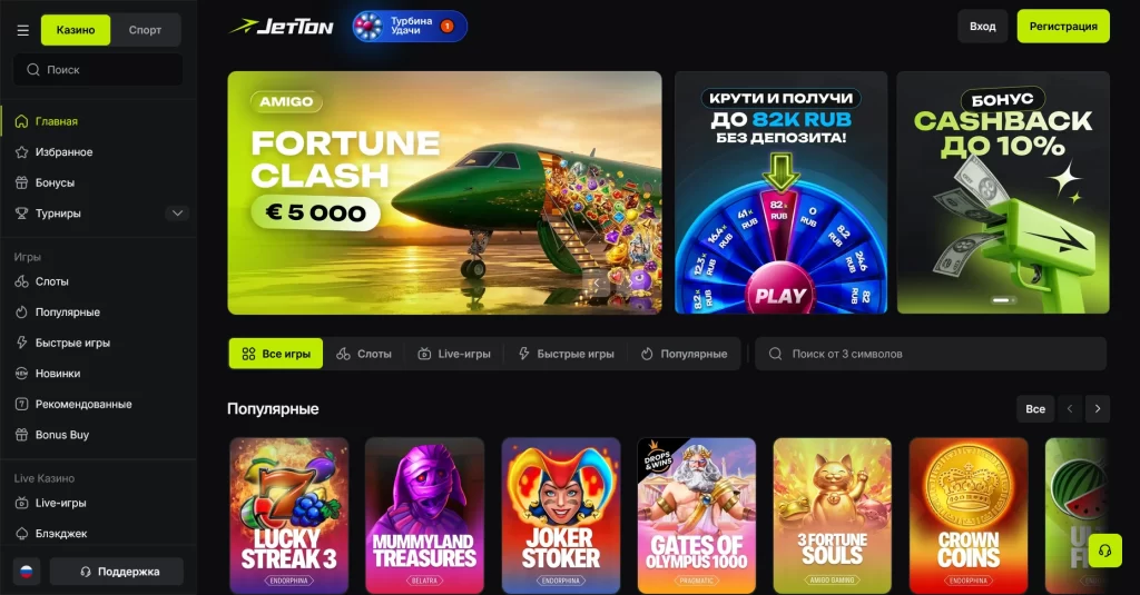 JetTon — это казино не про узкую специализацию, а про масштаб: большой выбор игр, много live, заметный welcome-пакет и касса, адаптированная под разные регионы.