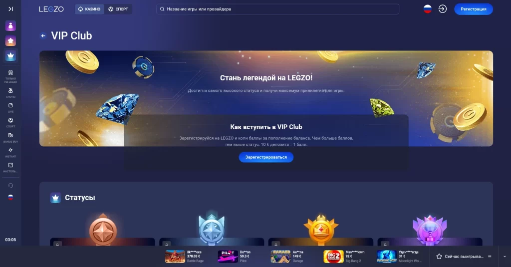 Интерфейс Legzo доступен на русском, английском, немецком, французском, португальском и испанском языках. Это удобно для игроков, которые предпочитают переключаться между локализованными версиями и не хотят тратить время на поиск нужных разделов.