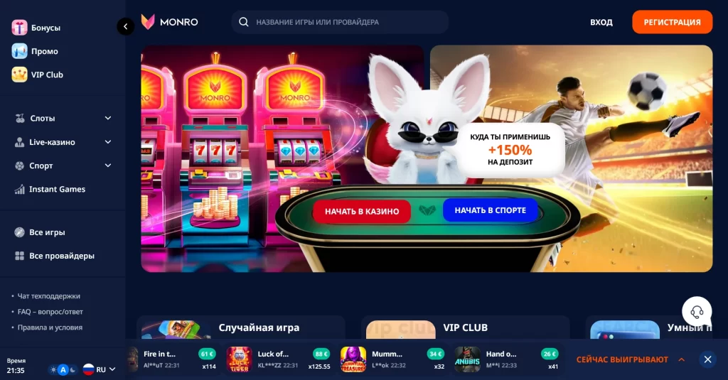 Monro — мультипродуктовое онлайн-казино с крупным игровым каталогом, live-столами, instant games и ставками на спорт. Площадка делает ставку на широкий выбор способов оплаты, мобильный доступ и понятную структуру бонусов для разных валютных счетов.