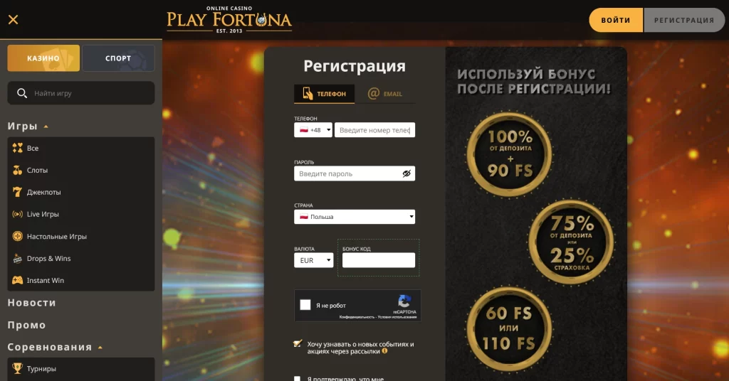 Play Fortuna — онлайн-казино на собственной платформе с большим каталогом провайдеров, круглосуточными выплатами и понятным личным кабинетом. Площадка сочетает широкий выбор платёжных методов, регулярные акции и удобную систему контроля бонусов, ставок и транзакций.