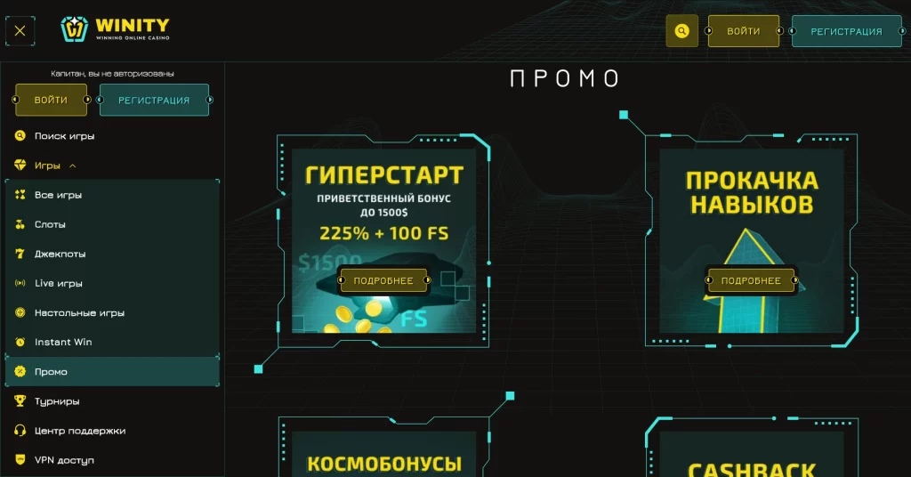 Отдельный слой UX — система «суперзарядов» и прокачка навыков в профиле. Игрок может усиливать бонусный процент, количество фриспинов, размер кешбэка, снижать нагрузку по вейджеру и повышать лимиты на вывод. За счёт этого Winity создаёт эффект прогресса, который редко встречается в классических обзорах казино.