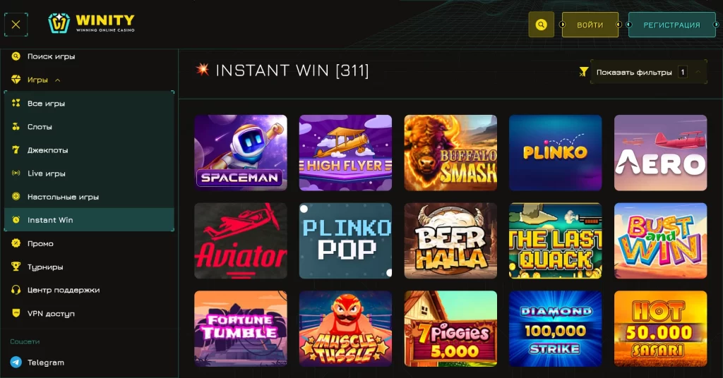 В библиотеке Winity собраны провайдеры разного профиля: Pragmatic Play, Amatic, AvatarUX, BGaming, Evoplay, Fantasma Games, Hacksaw Gaming, Novomatic, OneTouch, Popiplay, Revolver Gaming, Spribe и другие. Это хороший баланс между массовыми слотами, более нишевыми релизами и форматами быстрых игр.